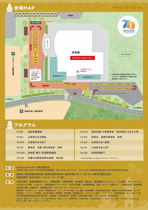 町制70周年記念事業として、「みはまふるさとまつり」を開催します。 各地区の山車や館が10年ぶりに 一 堂に会する機会となり、各地区の伝統芸能(からくり人形やお囃子、大太鼓や木遣り節など)の披露があります。 フィナーレには美浜音頭・美浜小唄を踊ります。出店(パターゴルフ、射的、キッチンカーなど)もありますので、皆さまお誘いあわせのうえ、ぜひご来場ください。